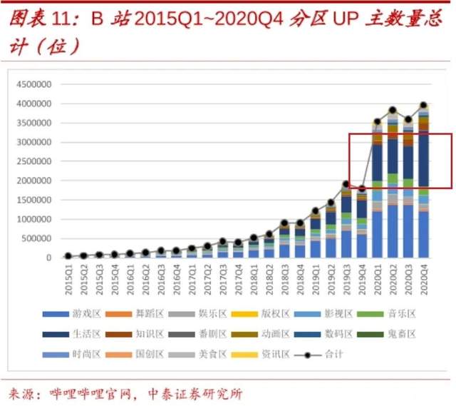 狂撒钱之下,可以看到B站生活区UP主数量,在2021年明显增加。