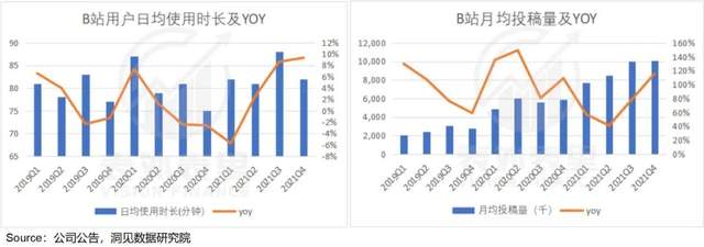 而随着创作者数量和内容品类的扩充,2021年B站的月均投稿量同比增长掉头直上;同时,用户的日均时长,明显上涨。