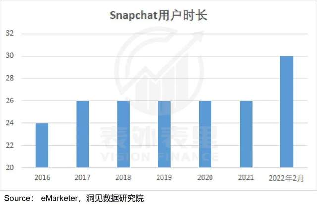 内容吸引下,Snapchat的用户时长,截至2022年2月,实现2017年以来的首次增长,达到30分钟。