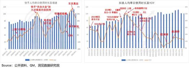 如下图,每次抖音、快手进行内容扩充时,都会带动用户时长的新一轮增长。