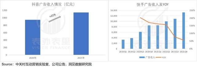 如下图,2021年抖音卖广告卖了1141亿,快手2021Q4广告收入再创新高,达到了132亿。而截止2021H1,用短视频模式呈现的广告,已经占整个互联网的42.6。