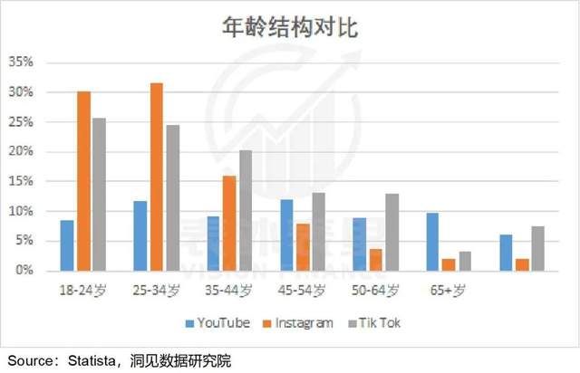 如下图,Tik Tok、Ins、Snapchat的主要用户群体都处于36岁以下,而YouTube用户中45岁以上的占比更大。