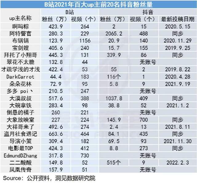 如下图,2021年B站前20名百大up主中,1/4没有抖音账号。即便有开通的,也只是少量在双边同步跟新。