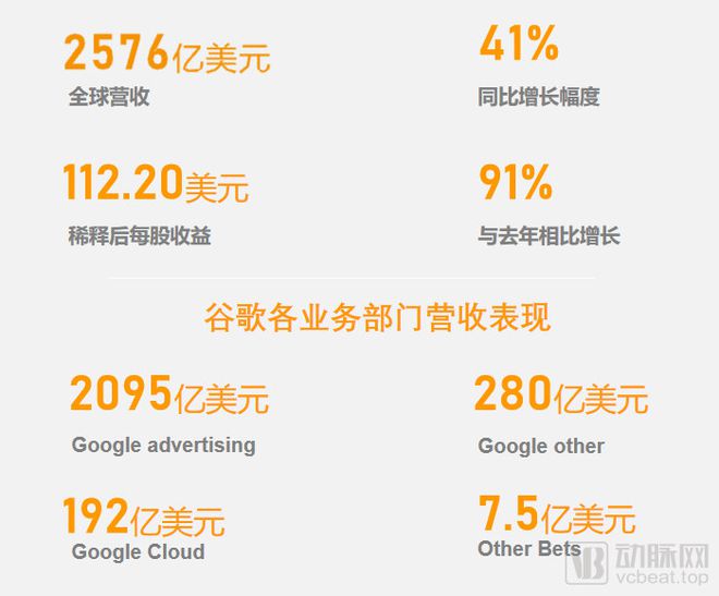 谷歌的母公司Alphabet在近期发布的年报中公布了去年的营收数据。据年报显示,在2021年,公司营收2576亿美元,同比增长41%;归属于母公司普通股股东净利润为760.33亿美元,同比增长88.81%。
