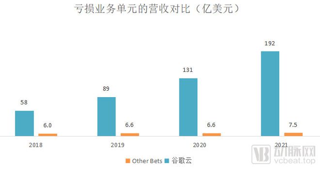 可以看到过去几年里,谷歌云和Other Bets都属于烧钱的项目。然而谷歌云属于逐步向好的趋势,营收逐渐增长,到了2021年,亏损大幅减少46%,并且增速跟上了主要对手的步伐。而Other Bets几年来营收没有本质的变化,亏损倒是一年比一年多,2021年更是达到53亿美元,约合人民币336亿。
