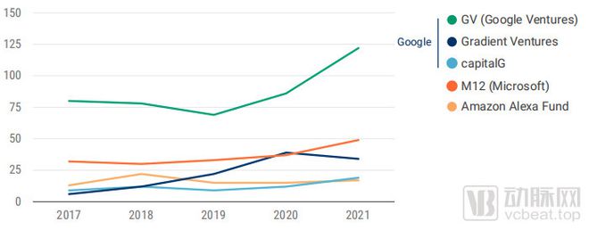 过去5年科技巨头特定风险投资部门的年度投资数量,数据源于CBInsights