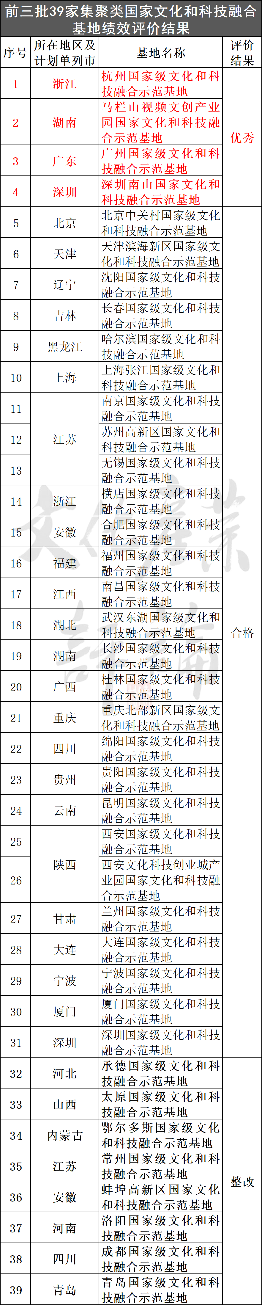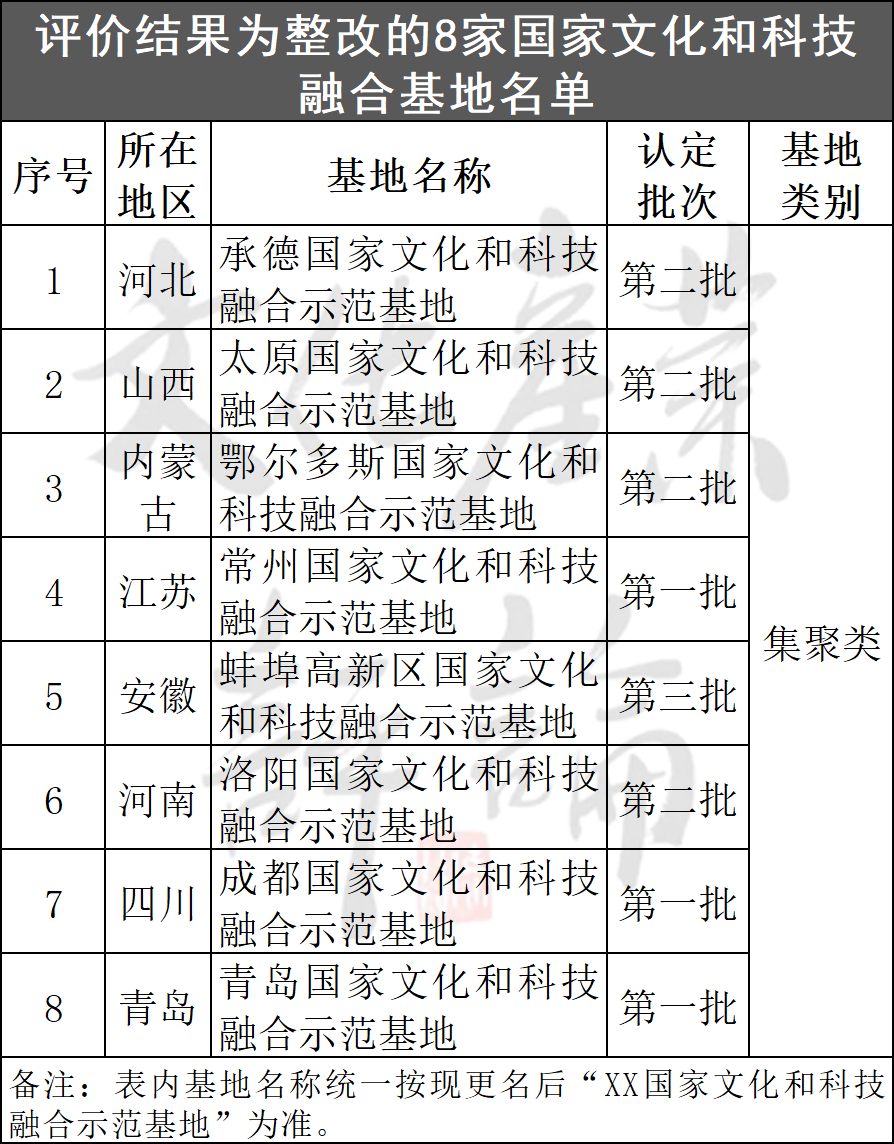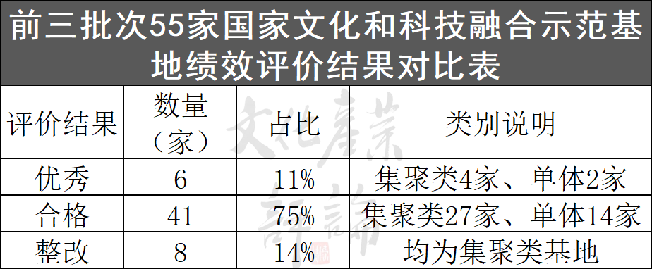 4月7日,科技部办公厅、中央宣传部办公厅联合发布《关于国家文化和科技融合示范基地绩效评价结果的通知》(以下简称《基地绩效评估结果》)显示,前三批55家国家文化和科技融合示范基地在分为优秀、合格、整改三类绩效评价结果中,共有6家优秀、41家合格,另有8家被要求整改。并对前两批基地进行了统一更名。