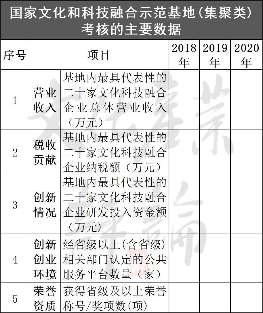 在量化指标评价上,集聚类基地重点考核近三年营业收入、税收贡献、创新情况、创新创业环境和荣誉资质五个方面数据(详见下表),主要包括基地内最具代表性的20家文化科技融合企业总体营业收入、纳税额、研发投入资金额,以及经省级以上(含省级)相关部门认定的公共服务平台数量和获得省级及以上荣誉称号和奖项数(项)。