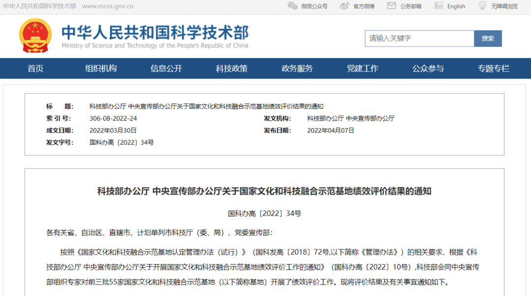4月6日,科技部办公厅、中央宣传部办公厅发布了《关于开展第五批国家文化和科技融合示范基地申报工作的通知》。通知指出,本次申报重点领域和方向为文化旅游、新闻出版、电影、广播电视、网络文化等科技创新领域。