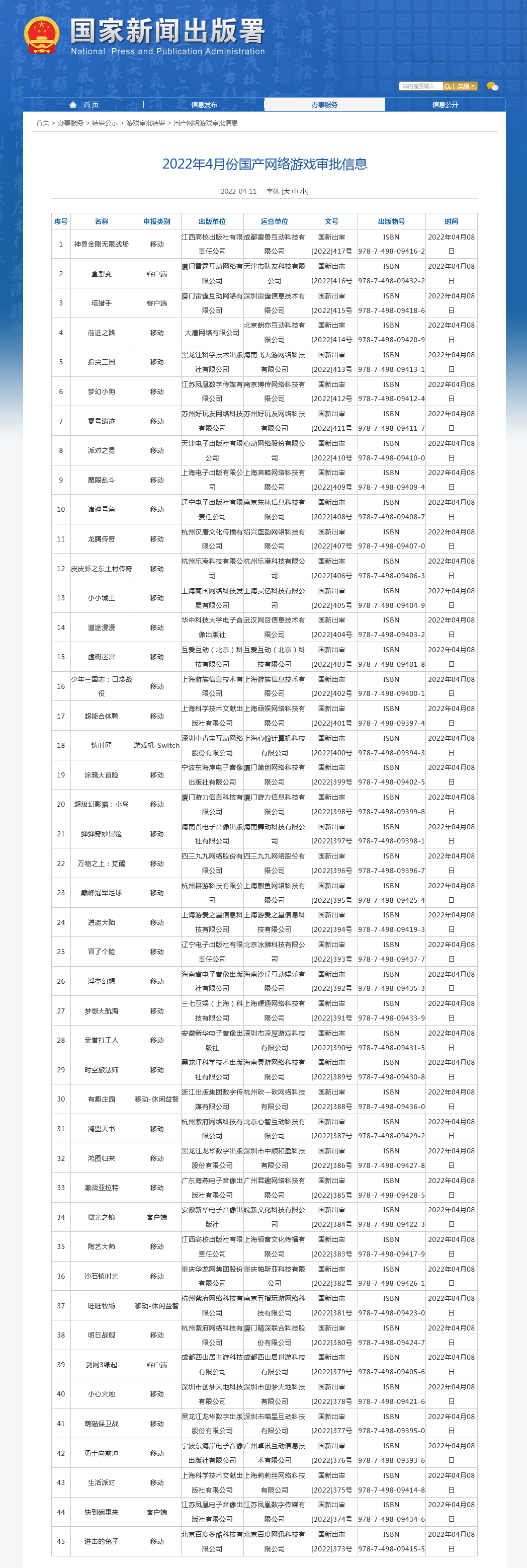4月11日晚间,国家新闻出版署官方网站公布了2022年4月份国产网络游戏审批信息,共45款游戏获得版号。这是自2021年7月以来,国家新闻出版署审批通过的首批国产网络游戏。