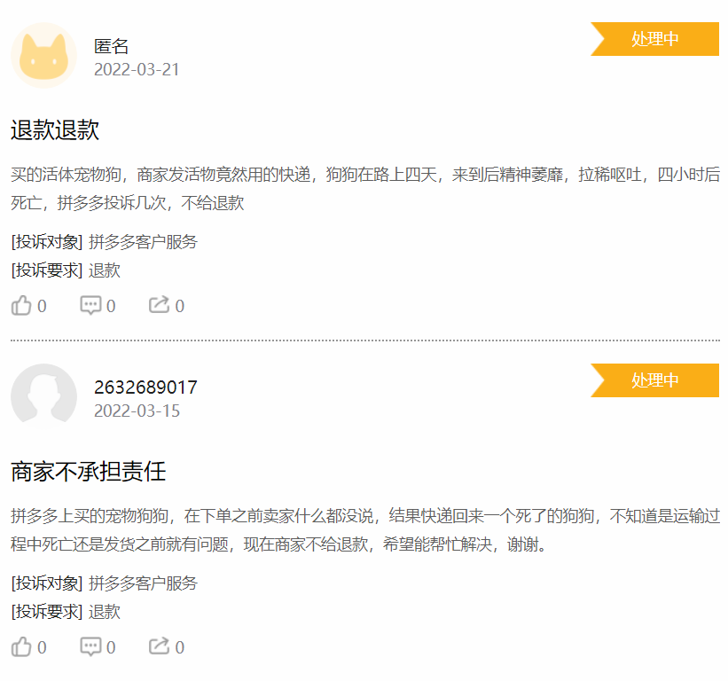 在黑猫投诉网站上,一位网友在拼夕夕上购买了宠物狗,因为物流不够及时,在路上封闭运输了四天,收货后狗狗精神萎靡、拉稀呕吐,四个小时之后就死亡了。