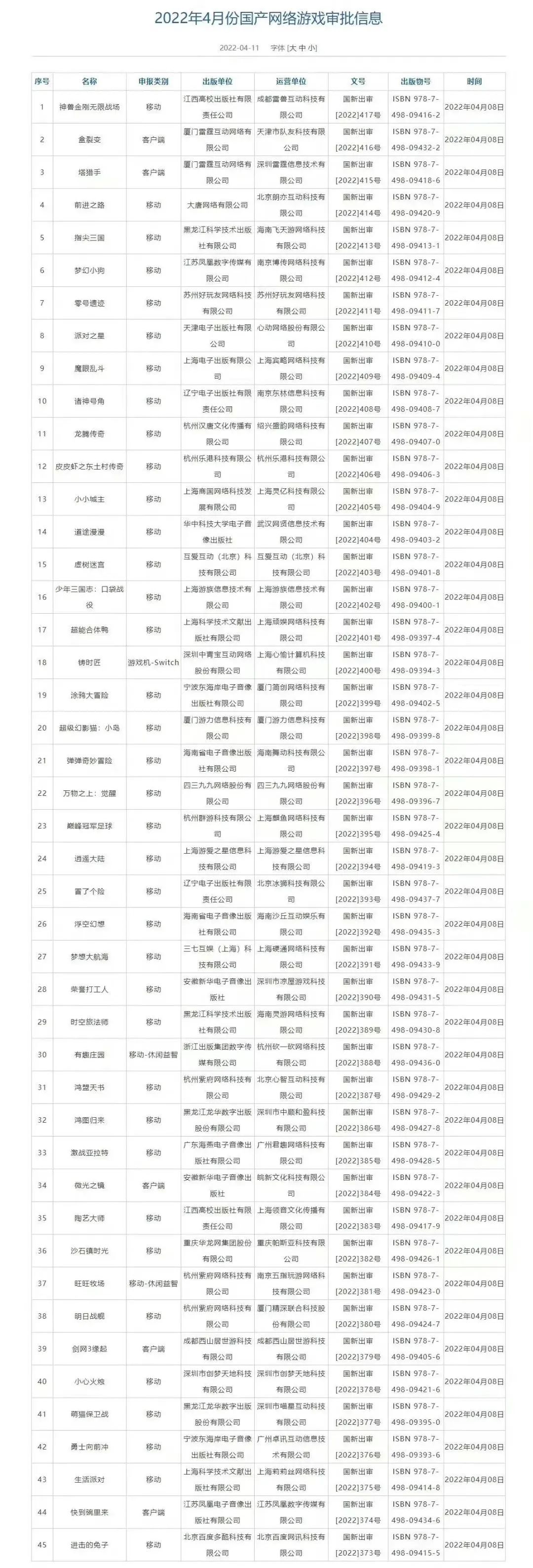 2022年4月,国产网络游戏审批信息发布,《沙石镇时光》《铸时匠》《剑网3缘起》《盒裂变》《派对之星》等 45 款游戏过审。消息一出,游戏板块整体飘红,多只游戏个股出现不同程度涨幅。