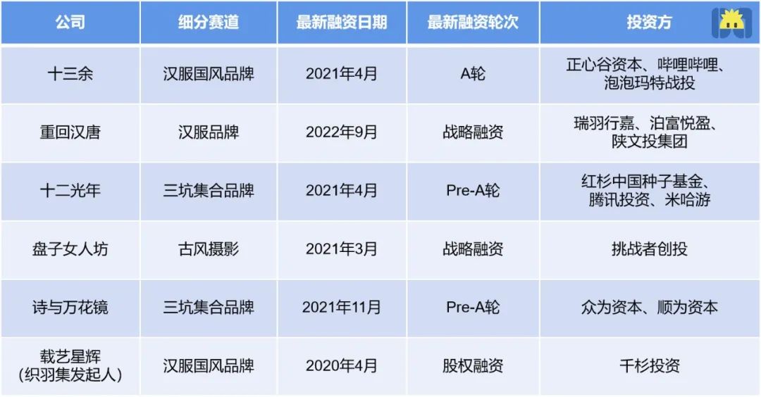 近两年,汉服相关品牌里倒是有一些创业公司赢得资本青睐。十三余、重回汉唐、三坑线下集合店十二光年都曾获得融资。