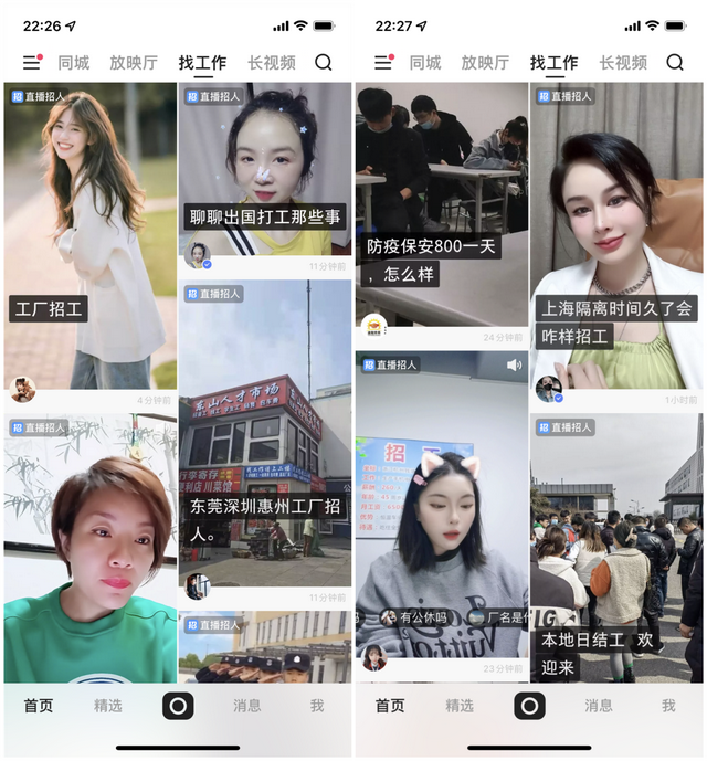 在4月初的8.0版本中,快手首页顶部栏由原来的“关注”“发现”“精选”“放映厅”变成“关注”“发现”“同城”“放映厅”“找工作”“长视频”——其中,“找工作”绝大多数都是面向蓝领用户的直播招聘需求,进一步凸显快手对蓝领招聘市场的渴望。