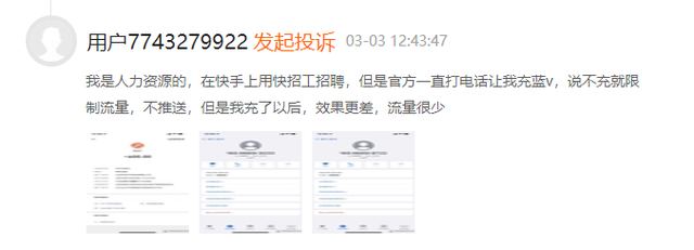 问题是,劳务中介数量众多,是可以给平台带来巨大利益的群体。在B端企业数量过少现实前,倘若减少劳务中介比例,那么就意味着快手刚切入招聘市场,就在千亿蓝领市场失去了竞争力——同样是3月29日,有自称做“人力资源”的用户在“黑猫平台”投诉称,“在快手上用快招工招聘,但是官方一直打电话让我充蓝v,说不充就限制流量,不推送,但是充了(600元)以后,效果更差,流量很少。”
