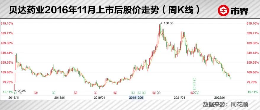 本来三兄弟可以凭借“中国小分子靶向抗癌龙头”的荣光不断创造历史,但这份情谊逐渐消磨殆尽。2016年公司上市前后,张晓东与王印祥相继离开,如今只剩丁列明一人执掌贝达药业,“贝达三剑客”最终分崩离析甚至走到了对簿公堂的地步。贝达药业股价在2020年7月冲至最高点160元/股,之后震荡下跌,截至2022年4月15日,报47元/股,两年蒸发470亿元市值。
