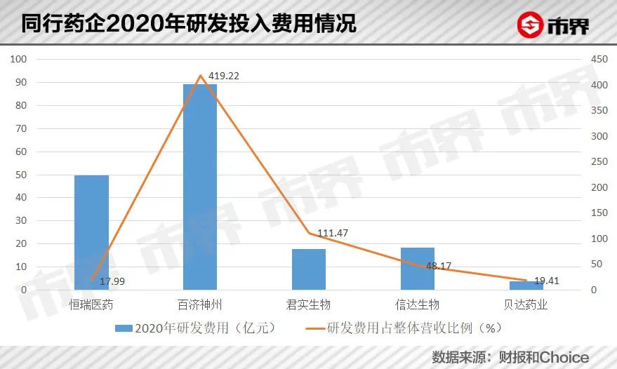 2018年至2020年,贝达药业的研发投入分别为3.04亿元、3.26亿元及3.63亿元,占整体营收的比例却在逐年下滑,从2018年的24.8%下滑至2020年的19.4%。2021年贝达药业研发费用为5.66亿元,占比为25.2%。