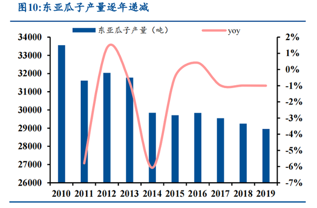 据民生证券研报,2015年-2018年,国内瓜子需求量呈现出下降趋势,2019年瓜子市场需求量回升至12779.8吨,但还不及2015年总需求量(13183.7吨),较2016年相比也仅增长3.02%,说明国人对瓜子的消费已经没早些年热烈。