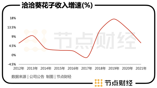 把时钟往前回拨,除了2019年和2020年,洽洽葵花子收入几乎都为个位数增长,甚至不乏负增长。