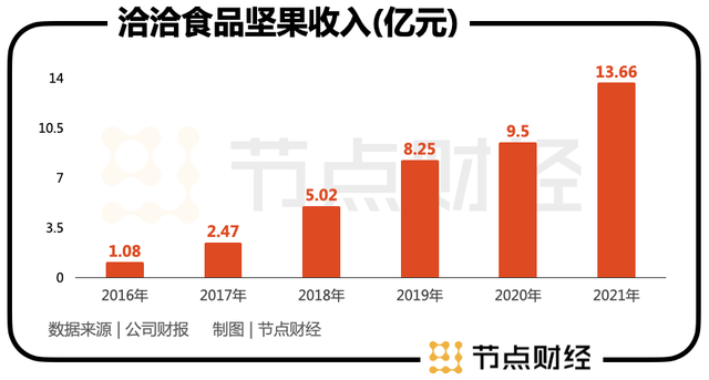 2021年,洽洽食品坚果收入13.66亿元,同比增长43.82%,营收占比从17.96%扩大到22.83%。