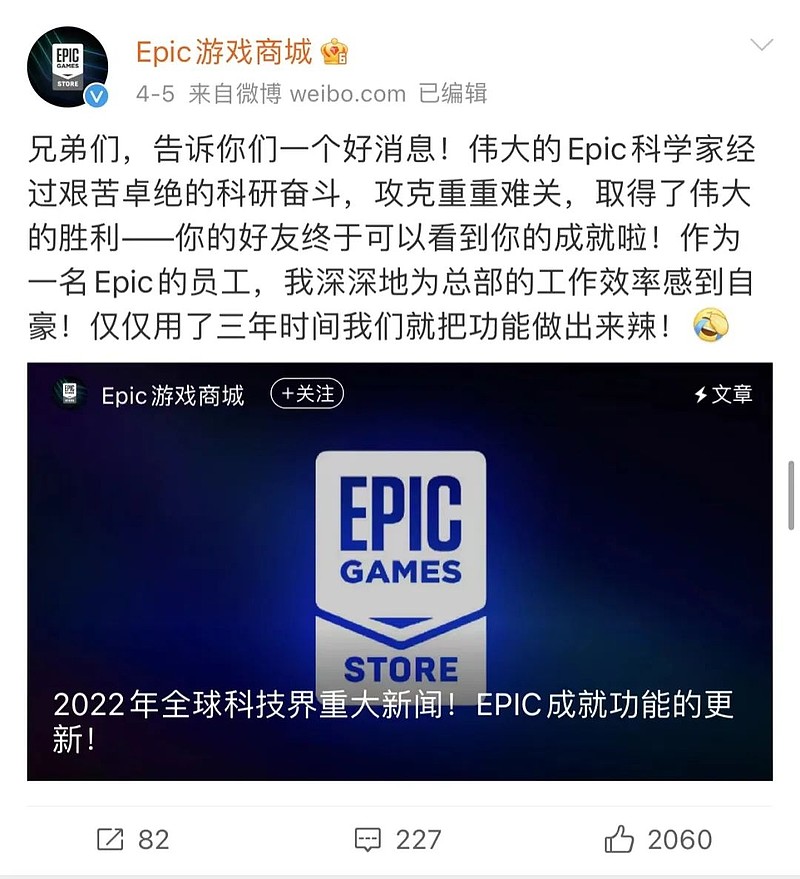 近期,PC游戏平台Epic Games Store终于上线了成就系统,Epic官博用了一段相当诙谐的声明来公布此事:“伟大的Epic科学家经过艰苦卓绝的科研奋斗,攻克重重难关,取得了伟大的胜利——你的好友终于可以看到你的成就啦!我深深地为总部的工作效率感到自豪!仅仅用了三年时间我们就把功能做出来辣!”