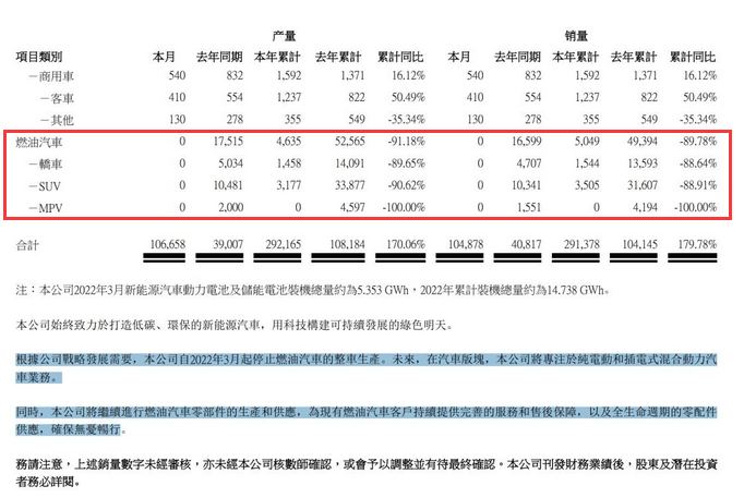 其次,燃油车之于比亚迪已经不重要了。2021年报显示,比亚迪一同卖掉了73万辆车,同比增75.4%,其中新能源车销量为59.4万辆,占比高达81%。在今年1-2月,比亚迪销售的新能源车18145辆,占总销量比重激增到了97.29%。3月份,比亚迪销售104338辆汽车,同比增160.9%,重点来了,燃油汽车销售数量为0。