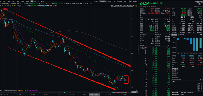 当然,B站也没有让资本市场“失望”。游戏版号发布的当日,B站在美股市场的股价较前一个交易日涨幅7.23%,市值上涨7.27亿美元,折合人民币逾46亿元,报收27.57美元/股,市值近687亿元,但随后便继续下跌,截至4月14日报收24.94美元/股,短短1年时间股价暴跌超八成,市值“蒸发”408亿美元。