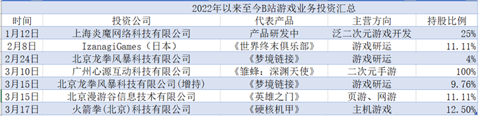 2022年以来,B站先后投资近10家游戏公司,甚至在短短8日内(3月10日至17日)就“一口气”连投4家,包括心源互动、龙拳风暴(增持)、漫游谷和火箭拳科技公司,B站全面布局游戏领域的野心昭然若揭。