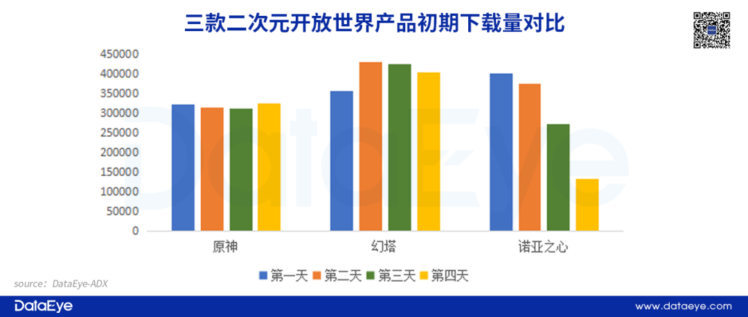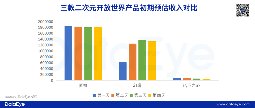 从收入维度来看:二次元开放世界并不是吸金的保障。根据七麦数据预估收入显示,《原神》iPhone端在上线初期连续4天收入超过180万美元,而《幻塔》也在前三天保持上涨,表现出不俗的潜力。相反,《诺亚之心》整体收入情况并不理想,与另外两款产品差距较大,也说明“二次元开放世界”的标签并不是高收入的保障。