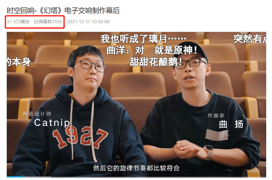 同样,《幻塔》在产品上线前夕直接在B站频道上发布“时空回响-《幻塔》电子交响制作幕后”。值得玩味的是,项目组并没有直接放出游戏音乐的完整版,而是通过9分40多秒的视频,向玩家展示《幻塔》中音乐的制作花絮和部分录制画面,并且通过“音乐”成功吸引到更多玩家的关注。目前该视频在B站取得超过30万次的观看数。