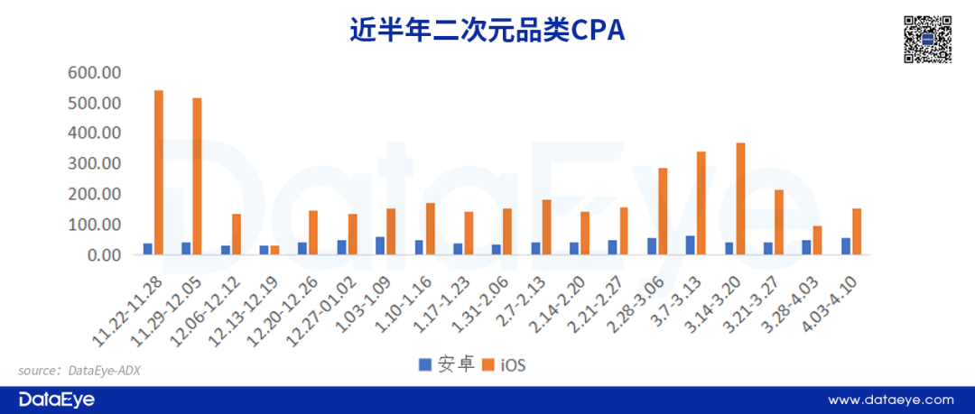 同时综合DataEye研究院CPA估算数据显示,近半年二次元品类安卓端整体波动较小,而iOS端相对较大,iOS端周均CPA超过200/A,但主要因为11月下旬和3月中旬两次拉高。对比产品上线时间的观察,《幻塔》上线阶段品类CPA估算处于低峰,而《诺亚之心》上线阶段的CPA估算也处于中等水平。