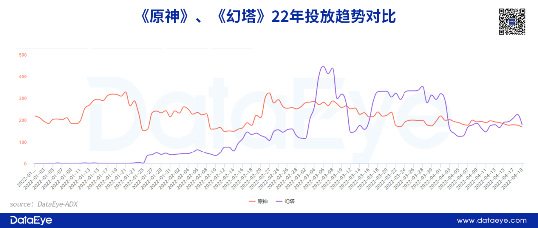 从投放趋势来看:投放佛系。根据DataEye-ADX数据显示,《原神》在产品上线初期,日均投放素材量约为160余组,投放趋势相对稳定。而《幻塔》在产品上线前突然加大投放力度,单日素材高达3400余组,但却在第二天快速下降至190余组,往后的投放量略显“佛系”。