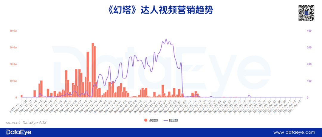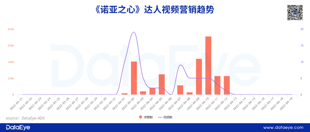 此外,从《幻塔》和《诺亚之心》的达人营销趋势来看,项目组会在产品预热阶段开始推动达人营销。不过《诺亚之心》整体视频数量较少,但转化数据可观。根据DataEye-ADX达人营销数据显示,《诺亚之心》目前仅有60余条达人营销视频,而点赞数超过25W次。