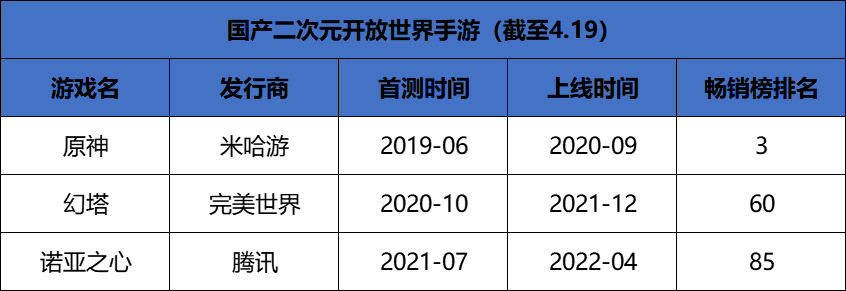 从产品数量来看:二次元开放世界玩家寥寥。《原神》给市场带来一次强烈的冲击,同时揭开了二次元开放世界的神秘面纱。整理发现,《原神》从首测到上线大约用时15个月,《幻塔》从首测以来经过14个月的产品打磨才正式上线。由腾讯发行的《诺亚之心》,从首测到上线时间也超过9个月。