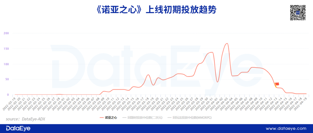 相比之下,腾讯发行的《诺亚之心》整体投放力度似乎更低。根据DataEye-ADX投放数据显示,《诺亚之心》在产品预热初期保持稳定的投放量,但力度不高,单日投放峰值约为160余组。而且在产品上线之后,投放量下降,单日不足10组。