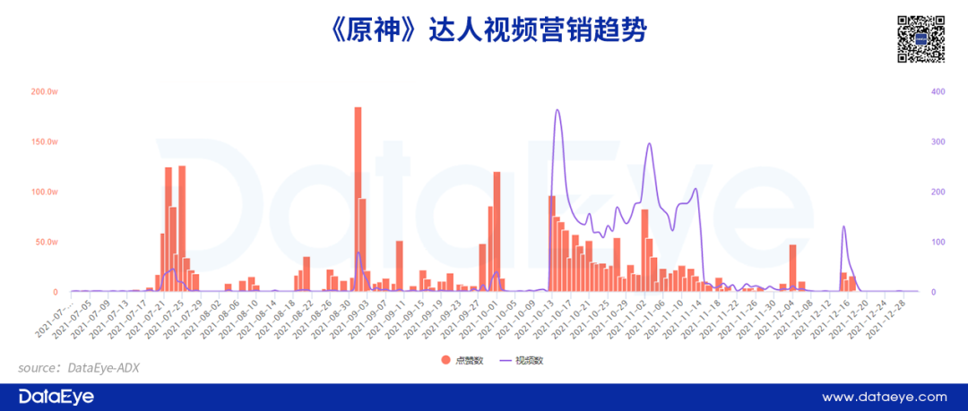 据DataEye-ADX达人营销数据显示,《原神》2021年下半年开始推行达人视频营销,通过观察发现,项目组不会持续长时间推行达人视频营销,而是依照产品关键节点进行营销,例如21年10月推出全新游戏版本,达人视频营销持续时间长达一个月。
