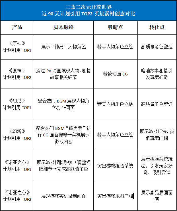 从创意素材来看:精美人设、战斗场景是主要元素。根据DataEye研究院整理三款二次元开放世界产品最多计划投放的创意素材进行对比: