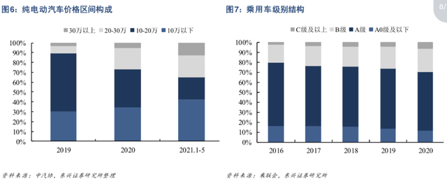 根据乘联会和东兴证券的数据,2016年-2020年乘用车级别结构中,A级和B级车合计占比超过80%,这种「纺锤式」结构与纯电动车的「哑铃式」结构刚好相反。
