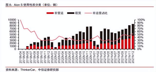就比如广汽埃安2021年的销量为12.3万辆,但贡献销量的主要是AION S,2021年卖了69219辆,占埃安总销量的56.3%。然而,AION S主要销售方是网约车和出租车市场,过去一直占据了AION S总销量的6-7成。