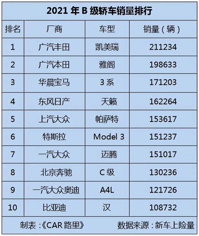 特斯拉Model 3是上榜车型中唯一的纯电轿车,2021年销量15.12万辆。比亚迪汉是上榜车型中唯一的自主品牌B级轿车,去年卖了10.87万辆。