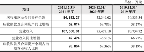 和巨额亏损对应的是云从科技的应收账款高企,近三年,云从科技应收账款居高不下,对应余额分别为3.1亿元、5.2亿元和4.2亿元,尤其是在2020年受疫情影响,应收账款占当年营收的近7成,除去疫情的影响,其他年份应收账款也已接近当年应收的4成。