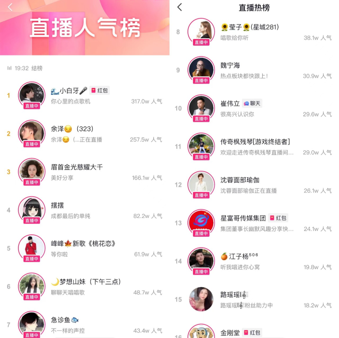 抖音在流量分配上的实时赛马机制让任何头部主播都不能轻易躺平:当主播在开播后获得一波初始推流后,之后的增量就只能通过和其他同层级直播间PK才能获得。系统实时在给直播间做排名,进而向用户青睐的直播间输送更多的流量。
