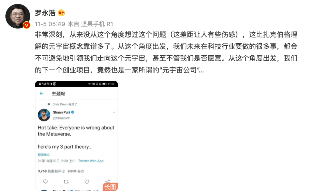 罗永浩也在呕心沥血完成“真还传”之后,心向科技创业的星辰大海,预备着借“元宇宙”的风口扶摇直上。