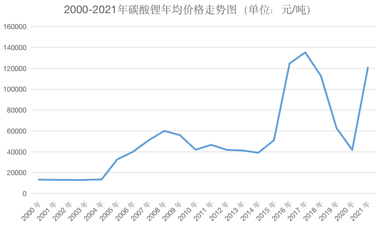 钛媒体APP整理了碳酸锂自 2000 年以来的年均价格的走势,可以看出,尽管不同时期价格有所波动,但其最高价格也仅停留在 13 万/吨——与如今的 50 多万/吨相差甚远。