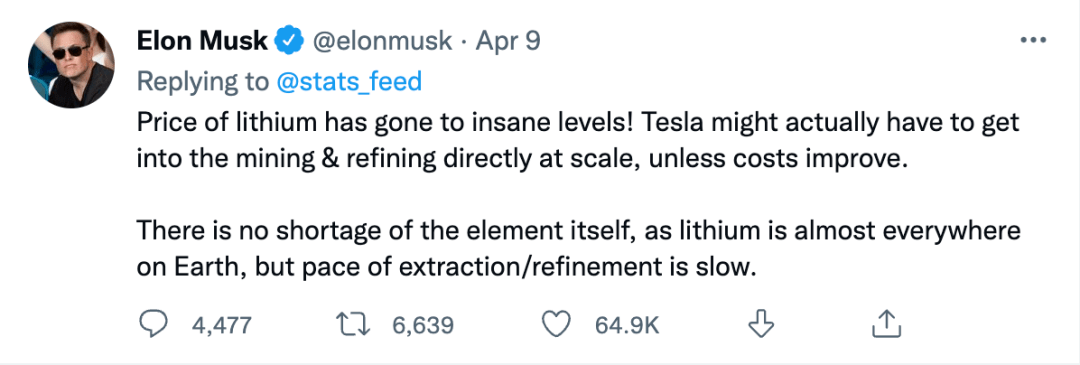 锂价格已经达到了疯狂水平。除非选择提高采购成本,不然特斯拉可能不得不直接大规模进入开采以及提炼领域。
