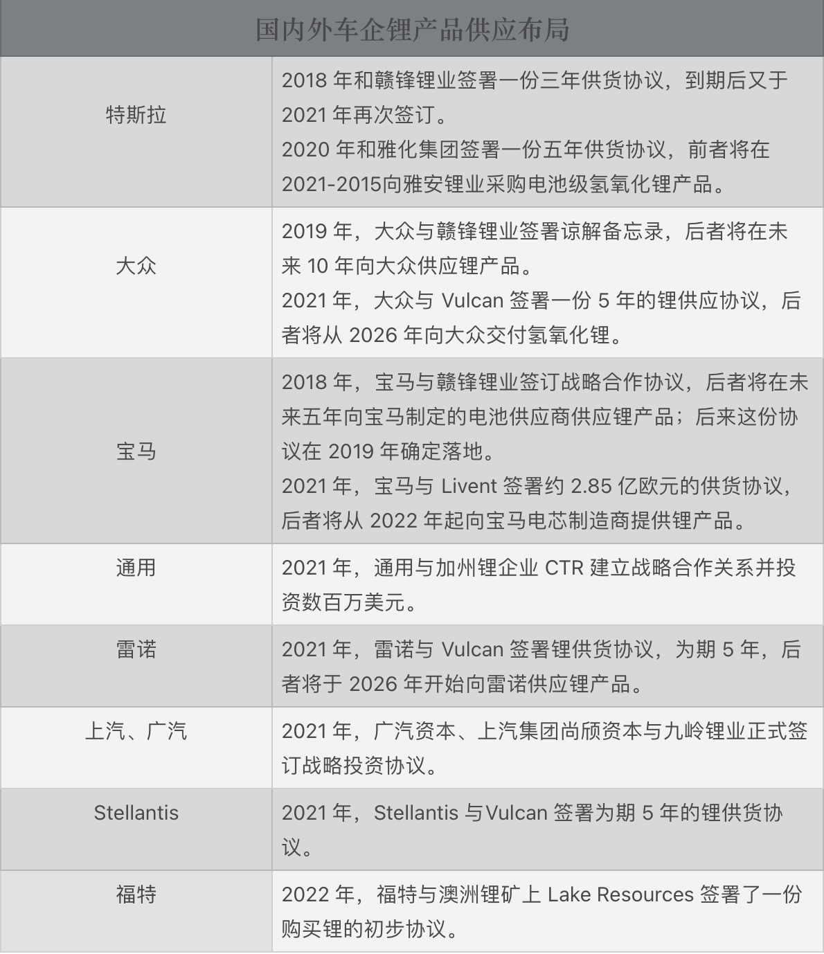 据不完全统计,特斯拉、大众、宝马等 9 家国内外主机厂商在 2018-2022 年间先后与赣锋锂业、Livent 等锂盐供应商进行合作;其中,仅是发生在 2021 年的交易就占了一半以上。