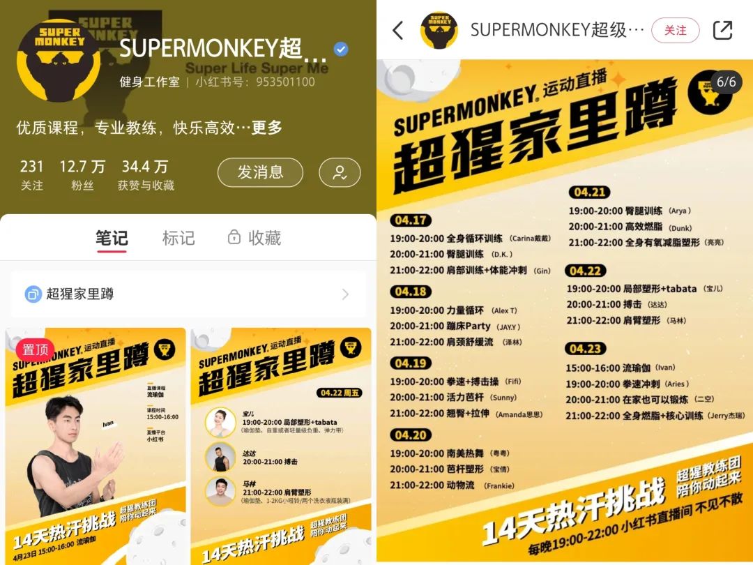 超级猩猩、keep等平台想要打造或者引入类似刘畊宏的明星教练:超级猩猩在小红书通过官方账号宣传直播课程,但直播健身是在各个教练的个人账号上,相当于公司导流给教练。Keep引入了帕梅拉、周六野等健身KOL,让她们在平台发布相关健身内容和课程,帕梅拉还在keep推出了付费课程。