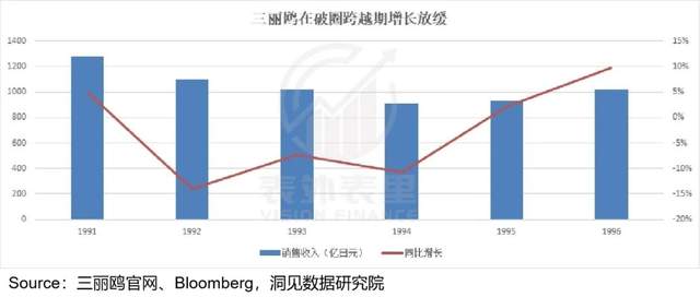 如下图,1991-1995年三丽鸥的业绩增速持续下滑,甚至连续三年负增长。