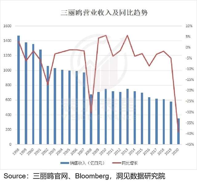 而成功跨越第二阶段的三丽鸥,进入互联网时代,由于线上零售的盛行,其实物类曝光方式受到了冲击,再次陷入危机——2001年之后,营收大多数时候都为负增长。