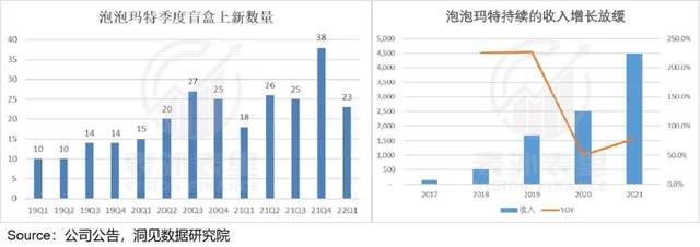 泡泡玛特也出现了类似情况,如下图,虽然IP形象上新在加快,但收入增速相比之前,已有所放缓。